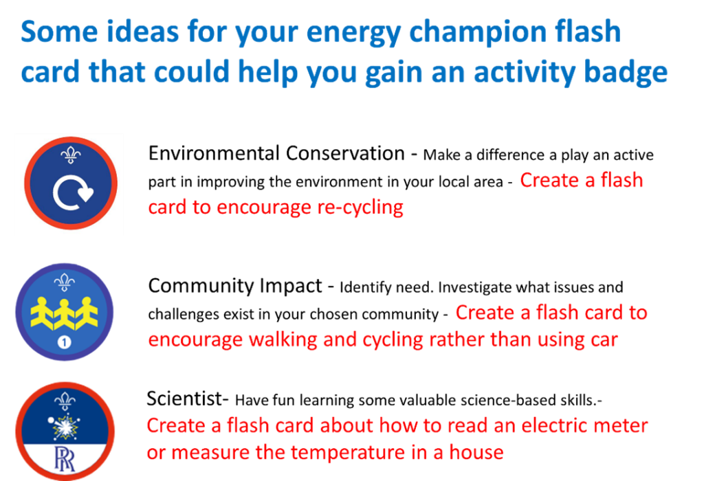 Most of the scouts were 8 – 12 years old and drew pictures on the front of their flash cards with examples of action on the back. Before moving to the next base each scout was awarded a Footsteps energy champion badge and took their flash card home to ‘champion’ energy saving.